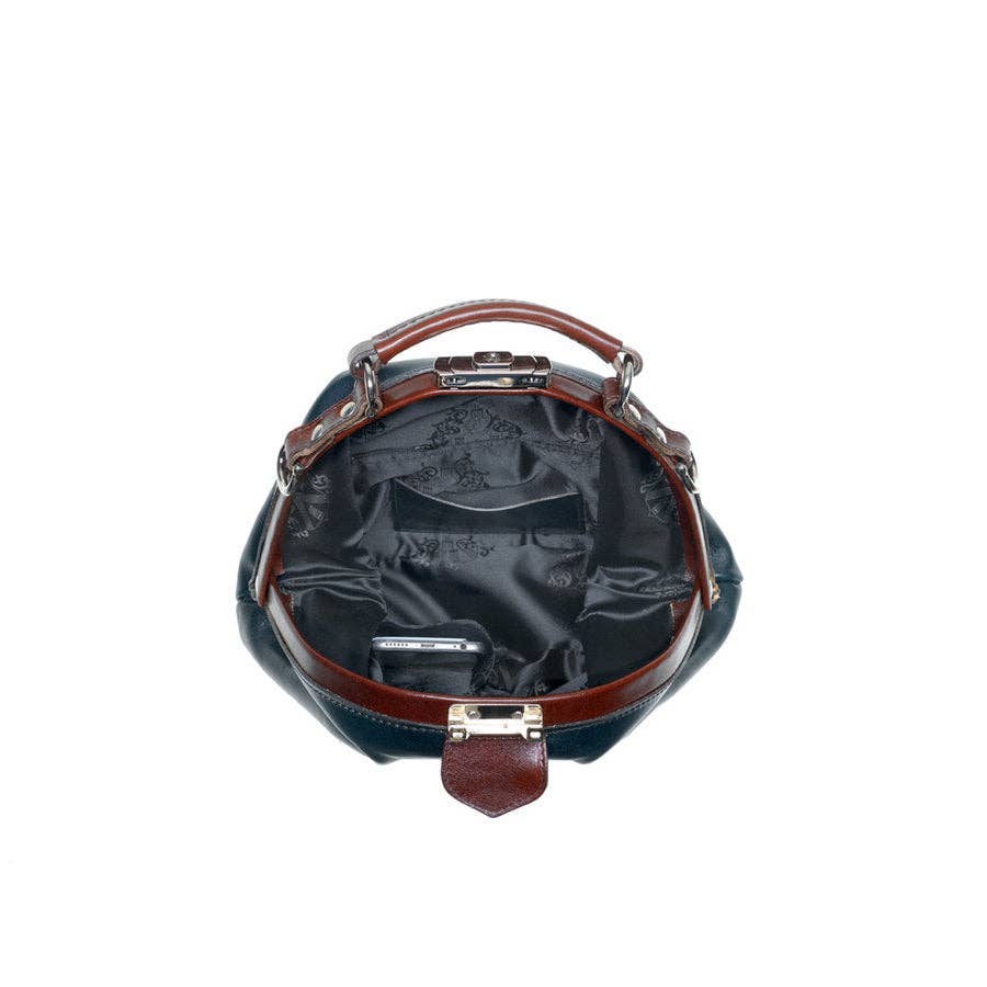 De leren handtas uit The Galore collectie opent via een beugelframe. Dit frame stamt af van de antieke dokterstas, dit is de grote broer van deze dameshandtas. De binnenkant van de tas is ecologisch geproduceerd nylon van sterke kwaliteit en de familiekam is in de voering verwerkt. De indeling van het interieur bestaat uit een hoofdvak en twee kleine vakken. Dit is handig voor het opbergen van sleutels, portemonnee en telefoon. De sluiting is een druksysteem dat kan worden vergrendeld met een slot, dit beschermt de tas tegen diefstal. Deze leren handtas van Mutsaers is ideaal voor op reis en om mee te nemen naar afspraken.
