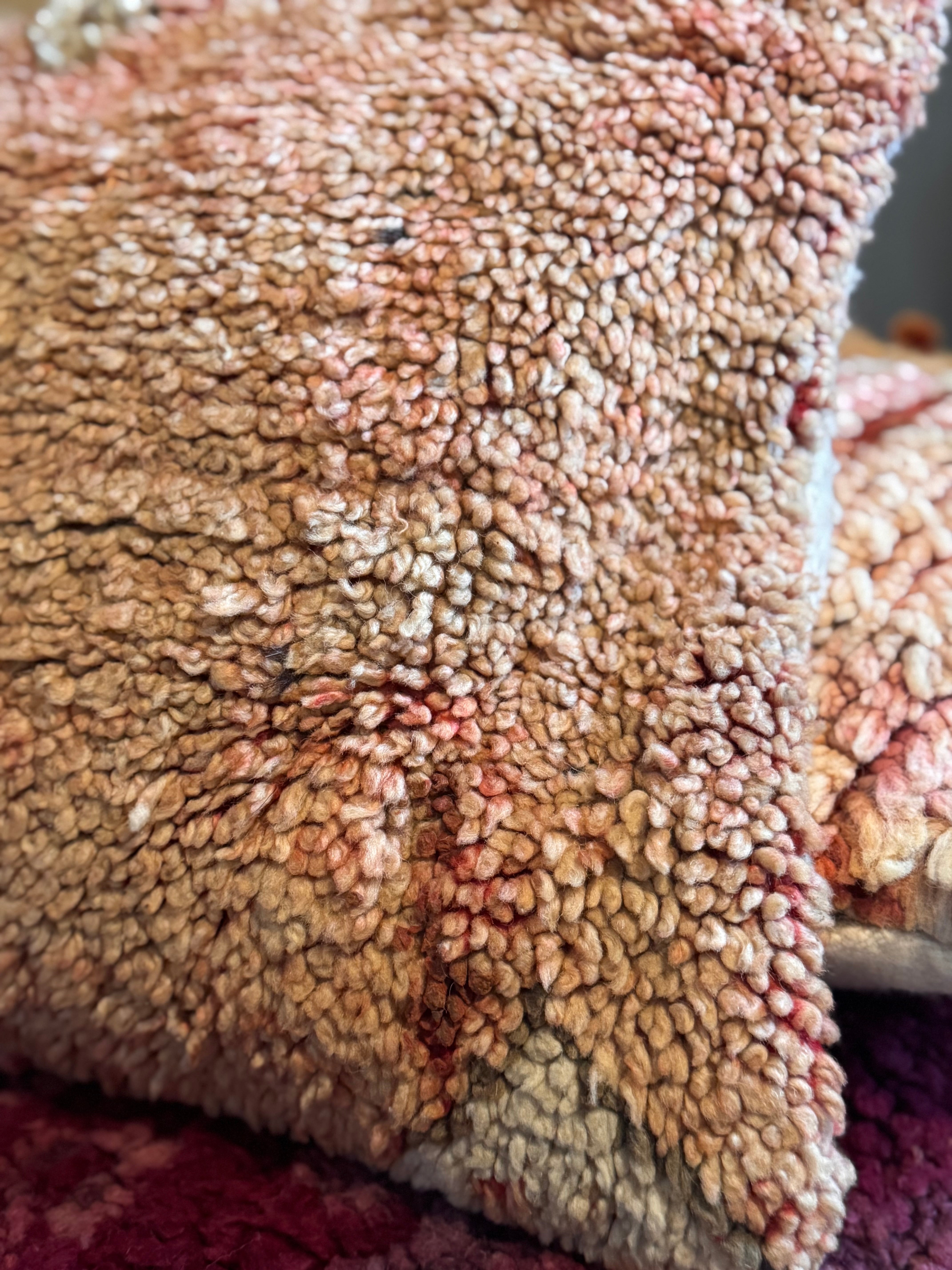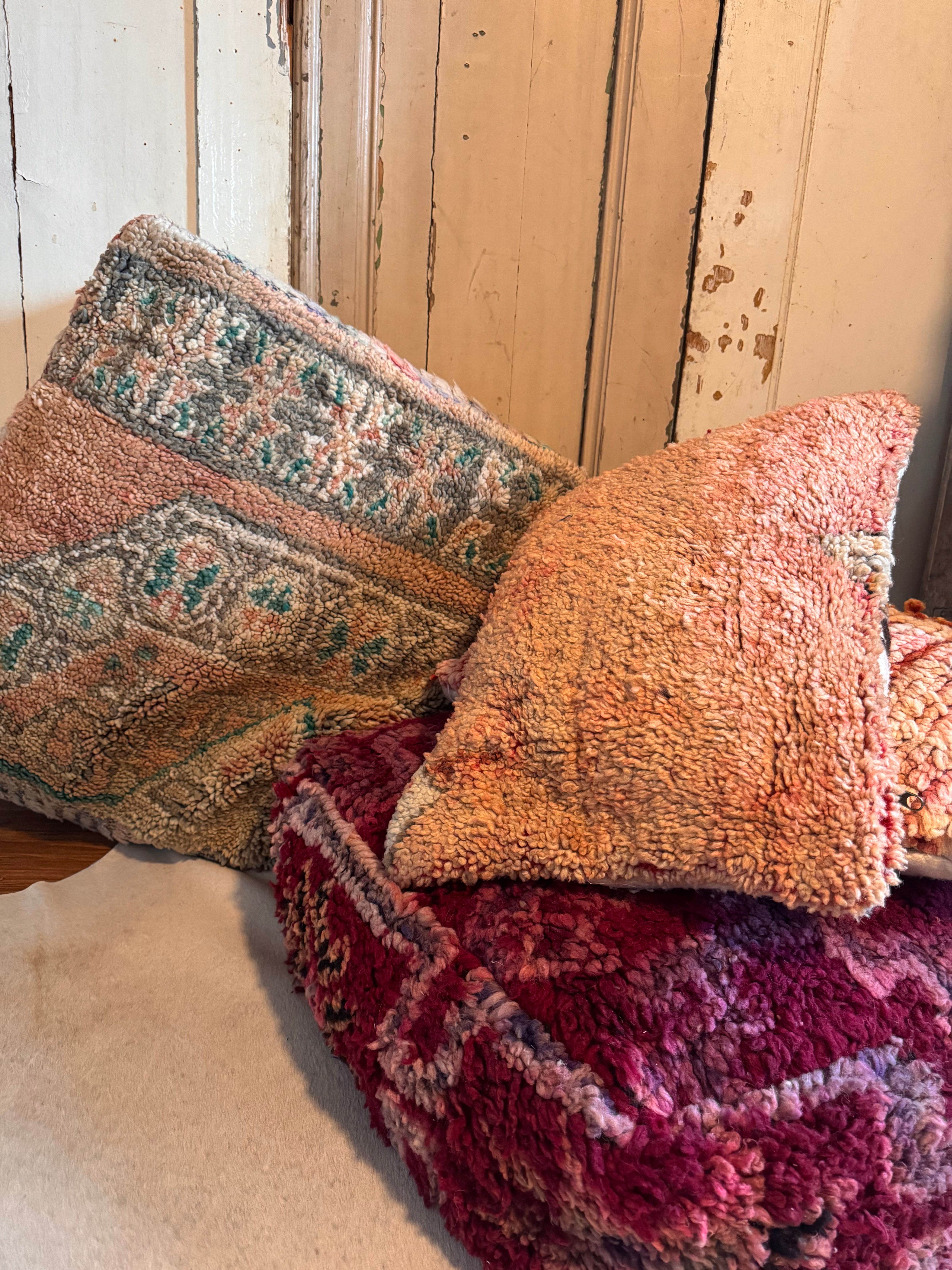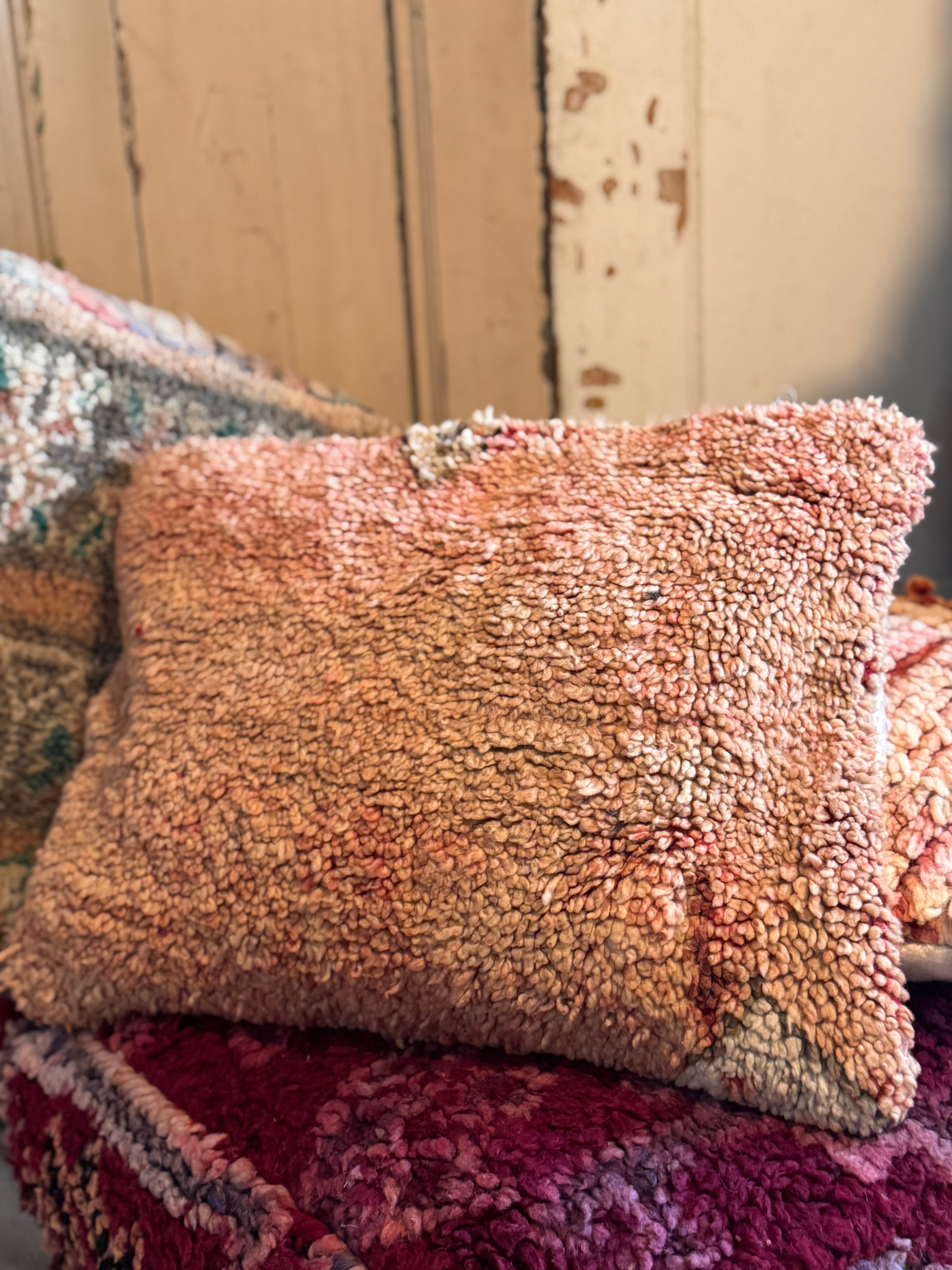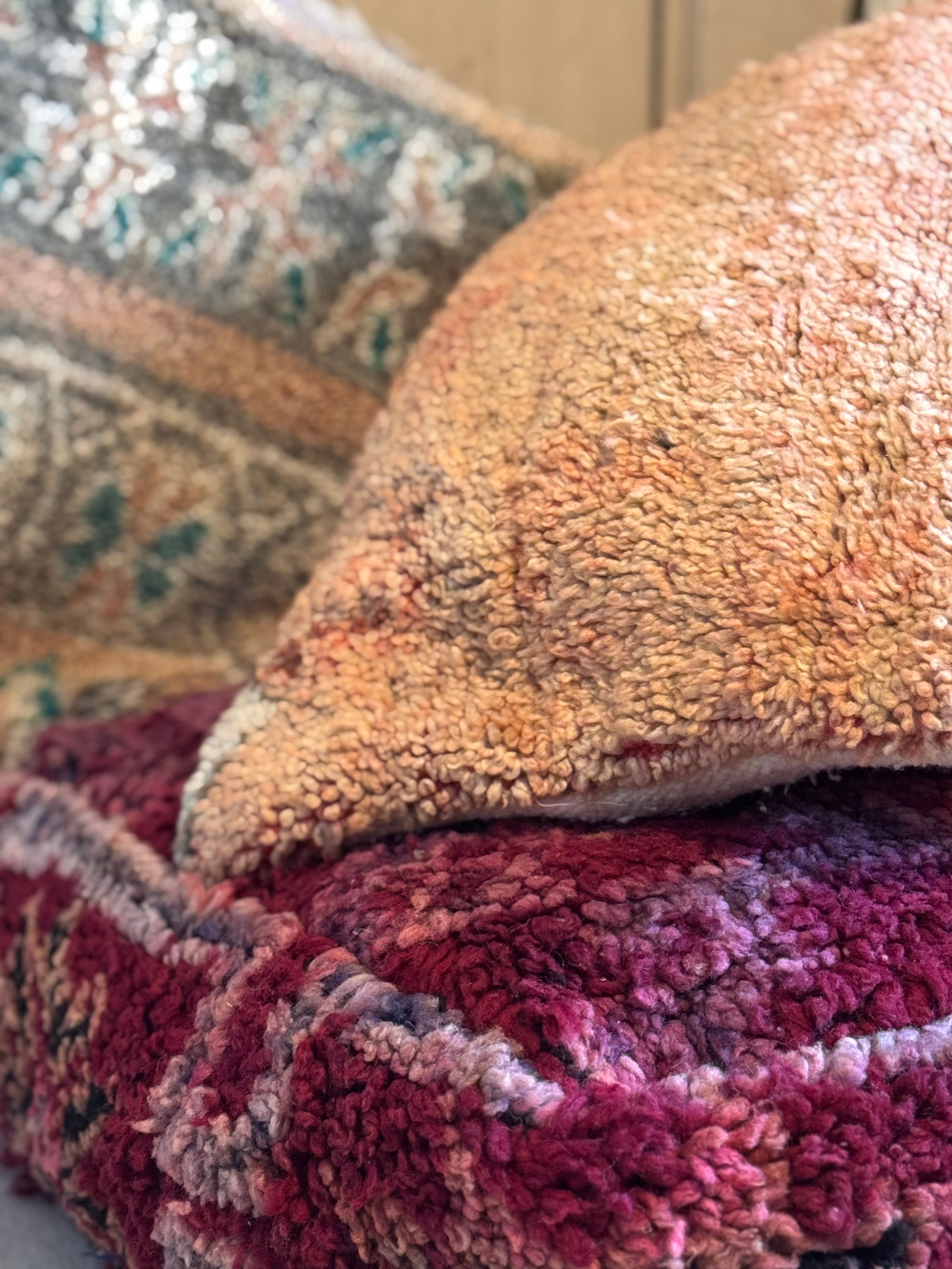 Een prachtige upcycled kussenhoes , handgemaakt in Marokko. Gemaakt van vintage kelims en berber tapijten, in een prachtige combinatie van materialen en kleuren. Boho perfect, dubbelzijdig of met katoenen keria achterkant.