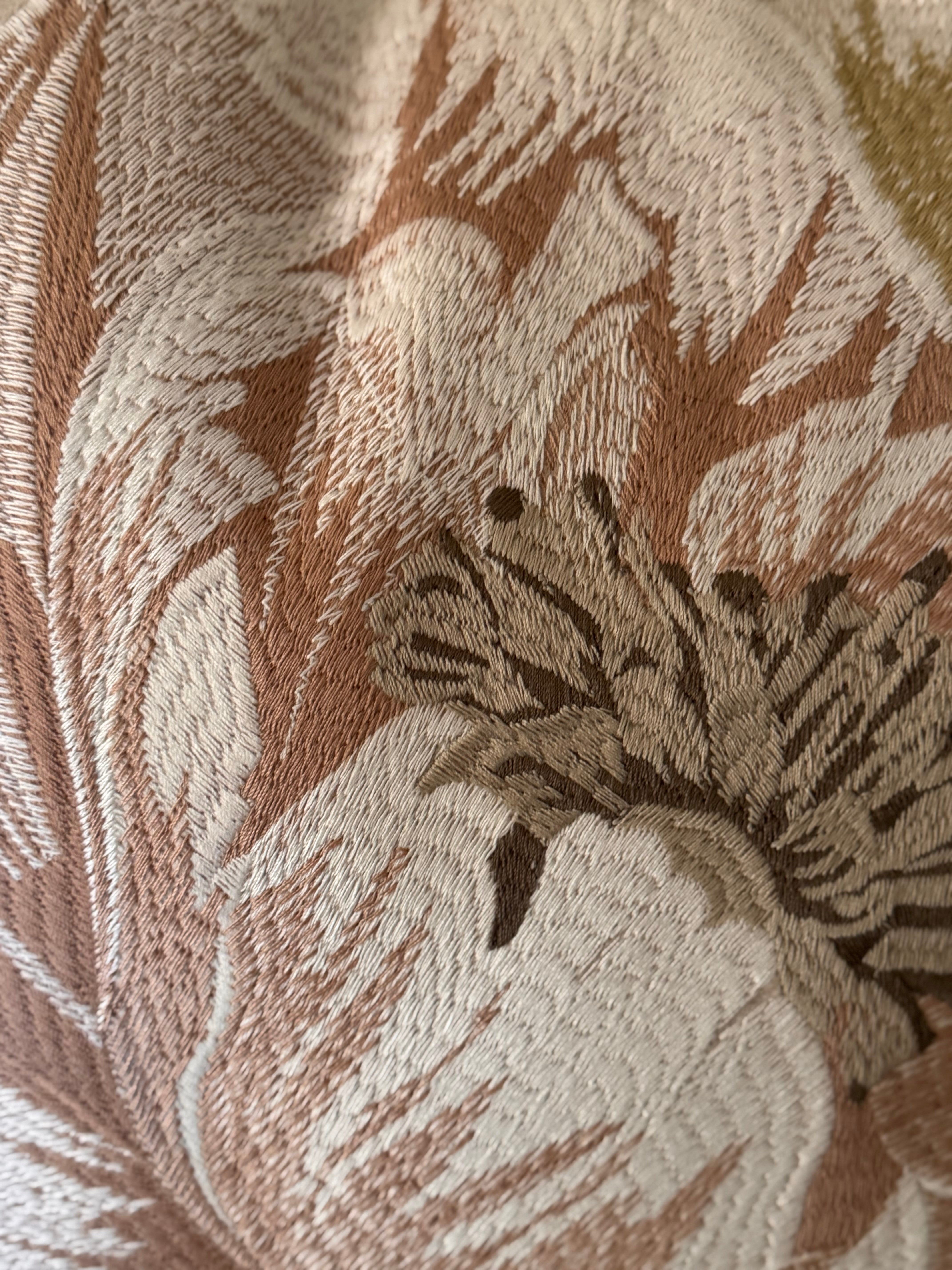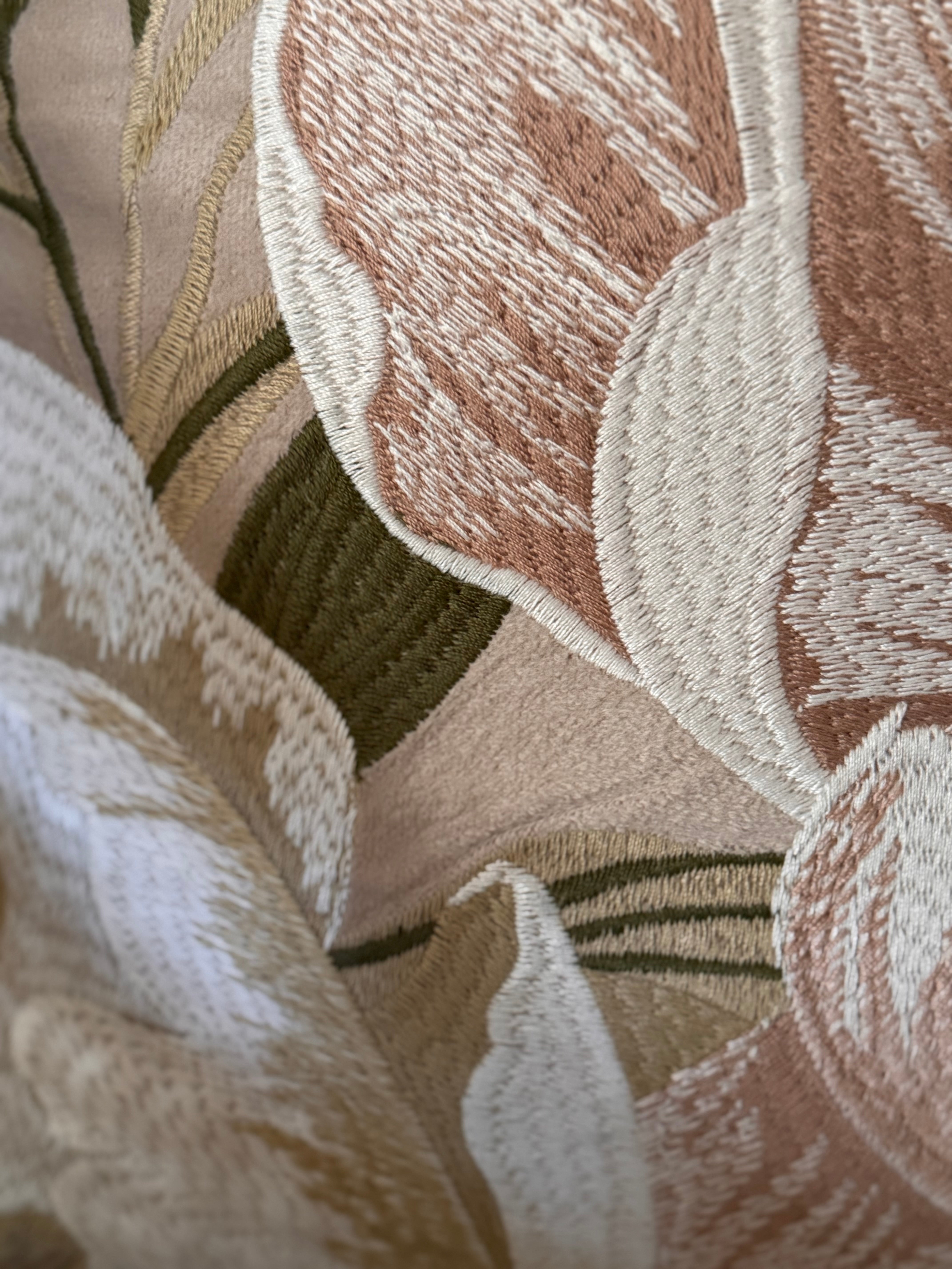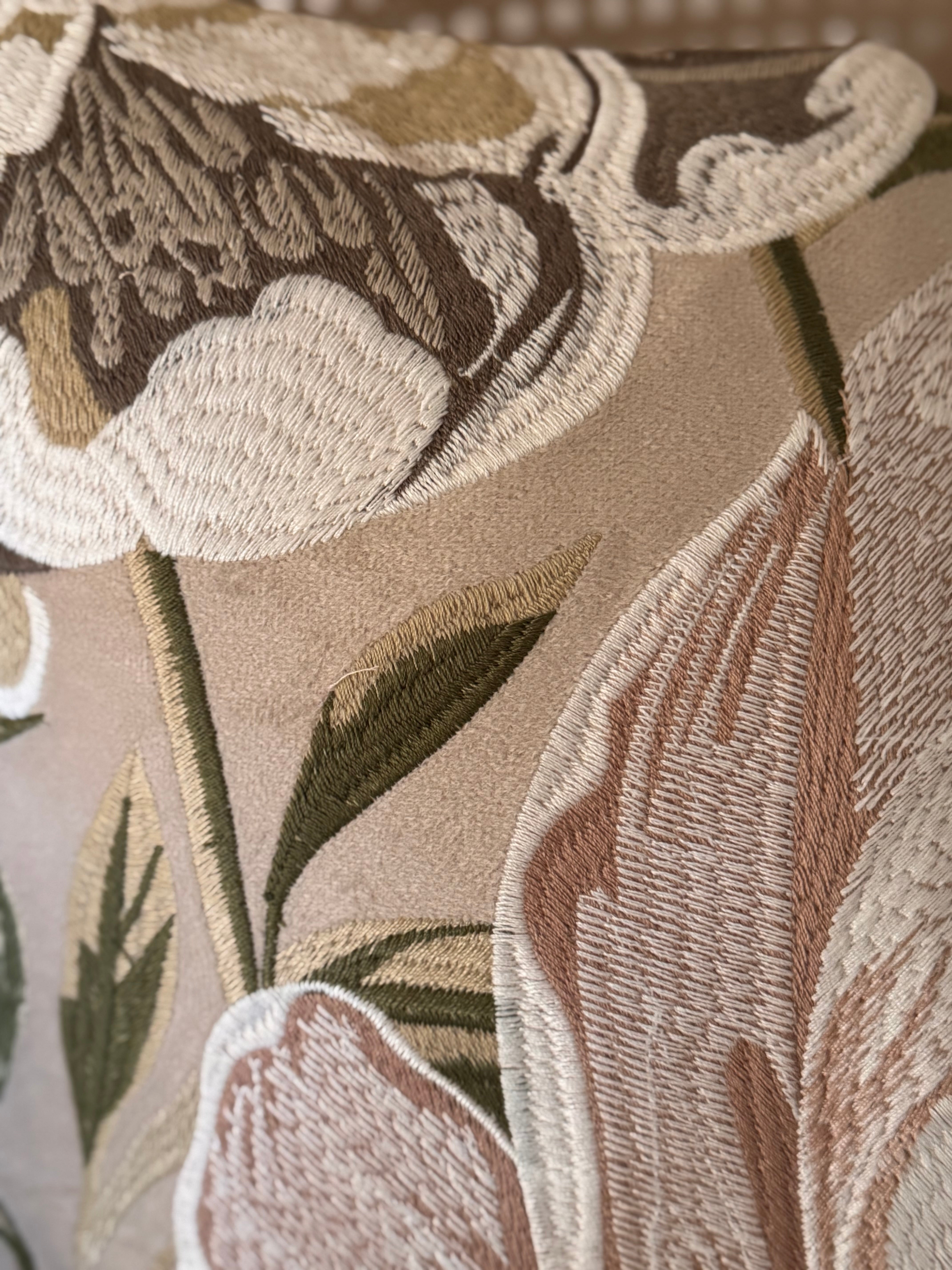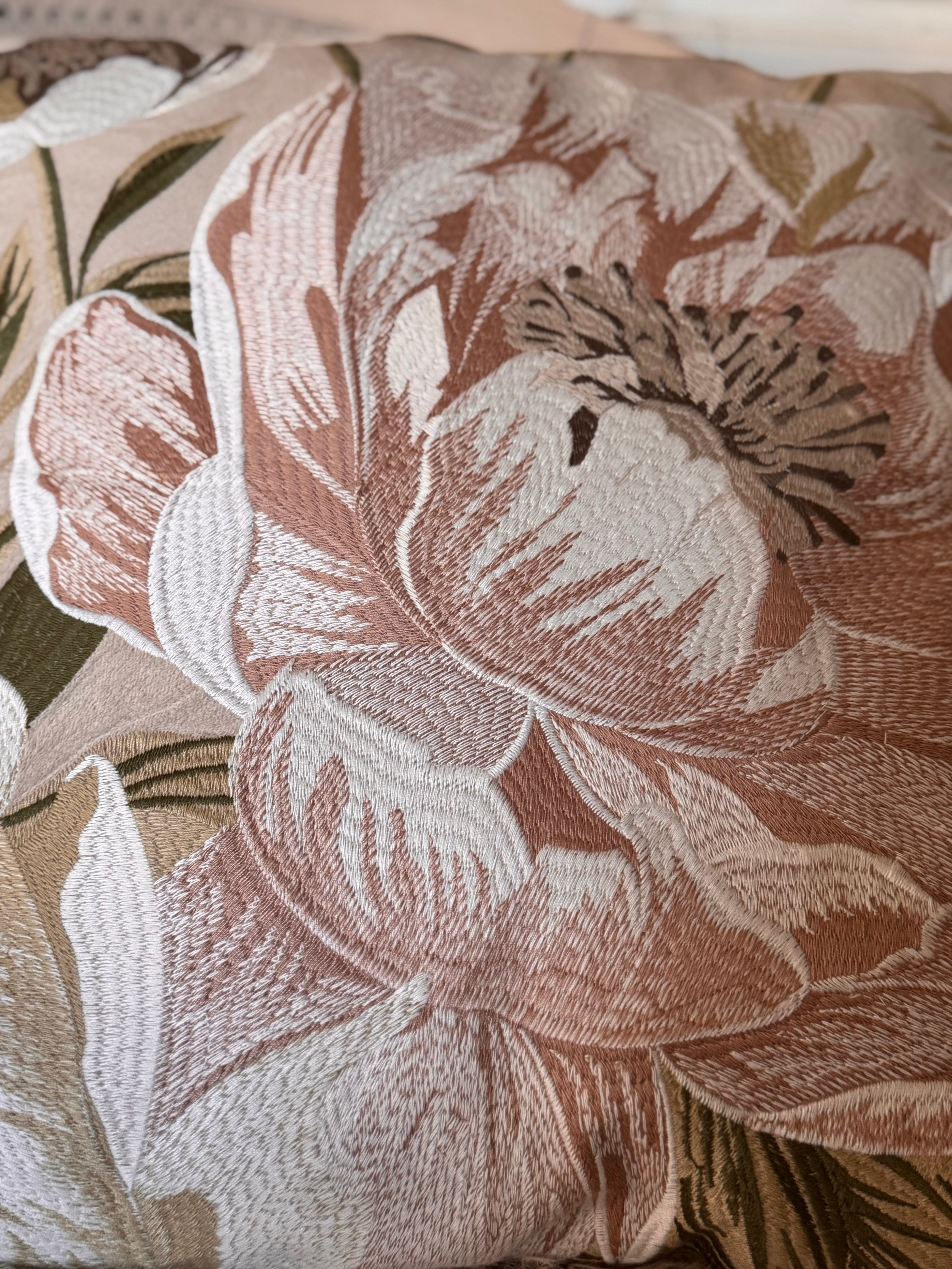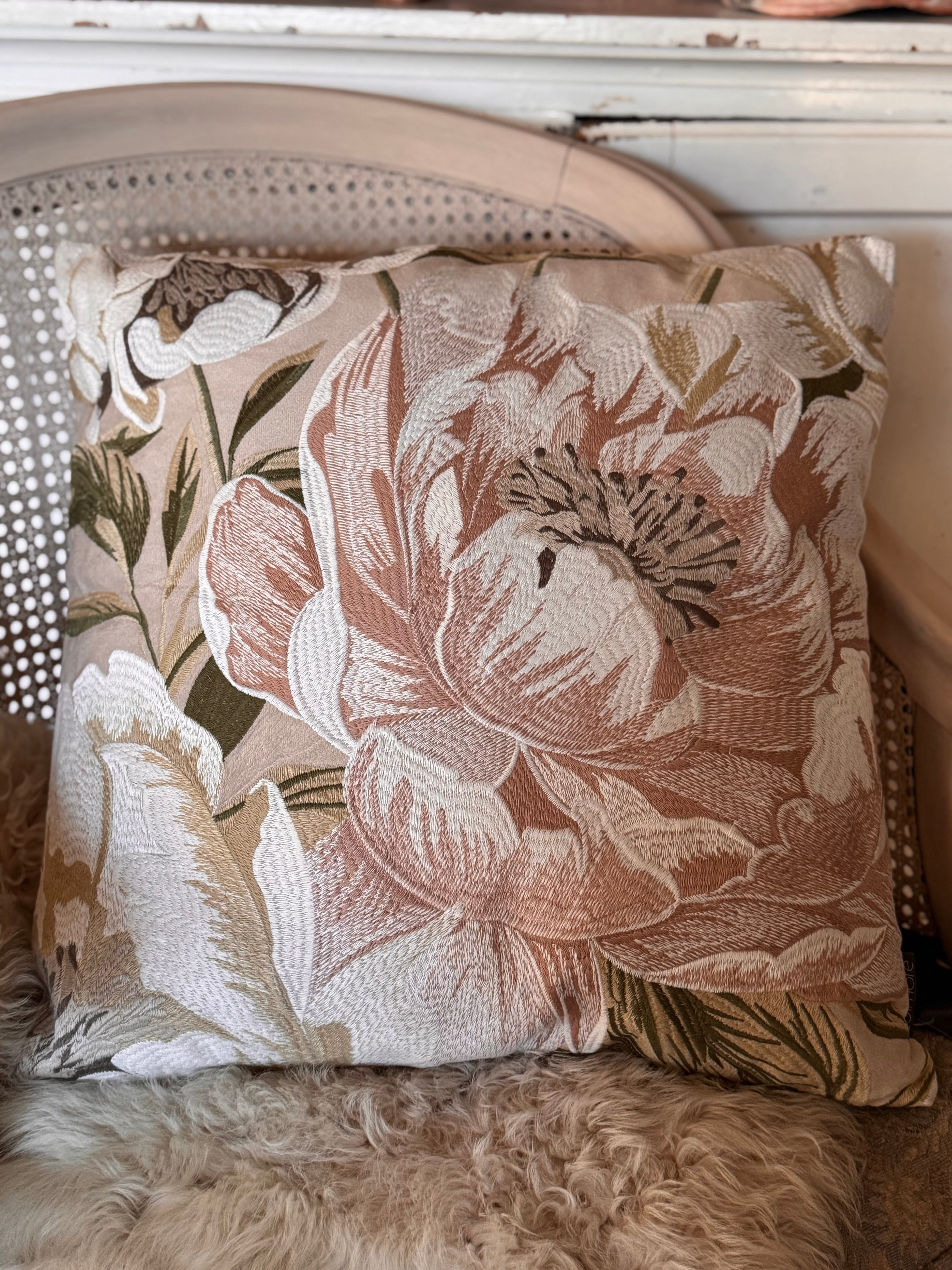 Voeg een vleugje vintage bohemian flair toe aan je interieur met dit prachtige Kussen met een gestikte roos