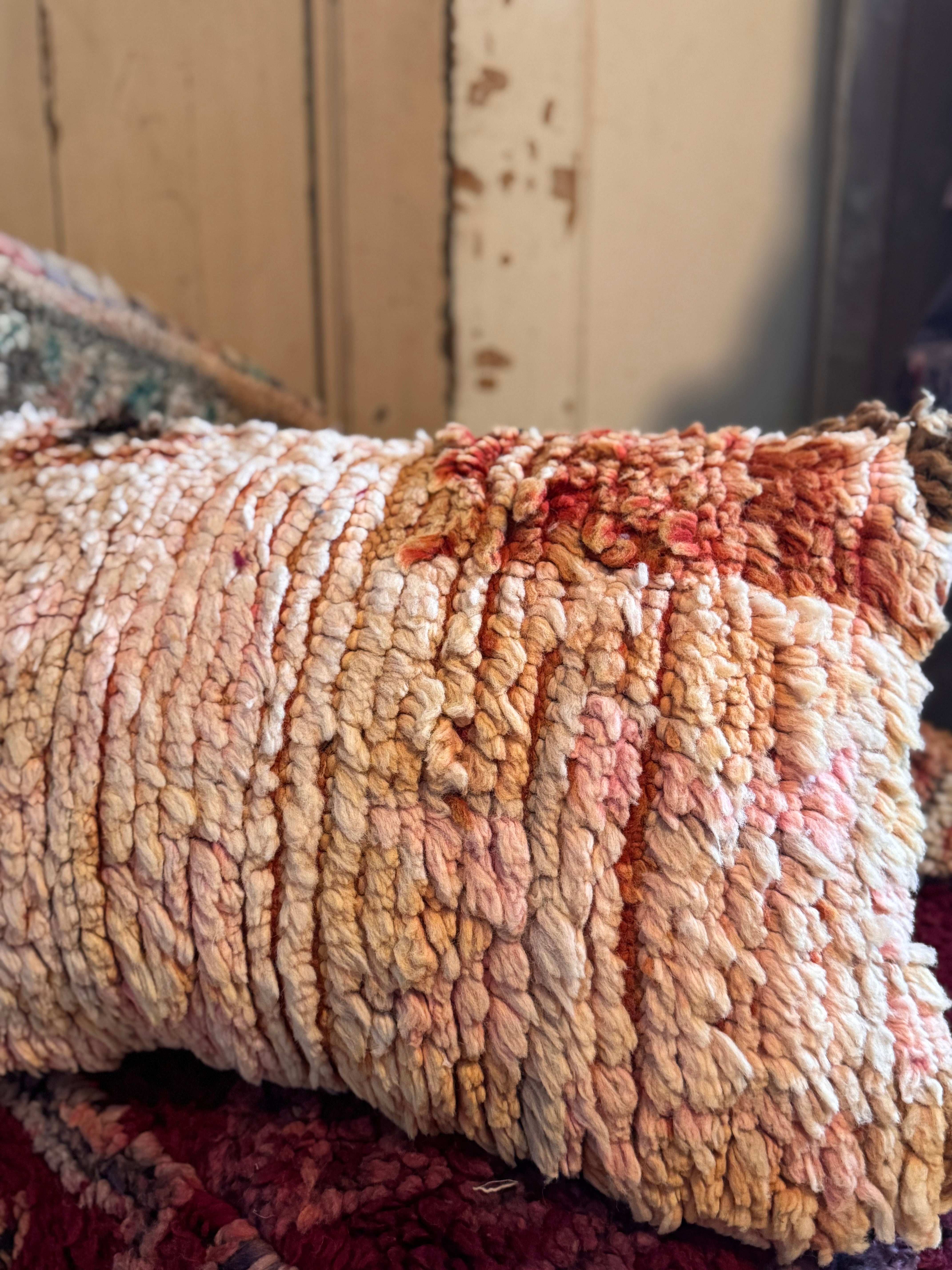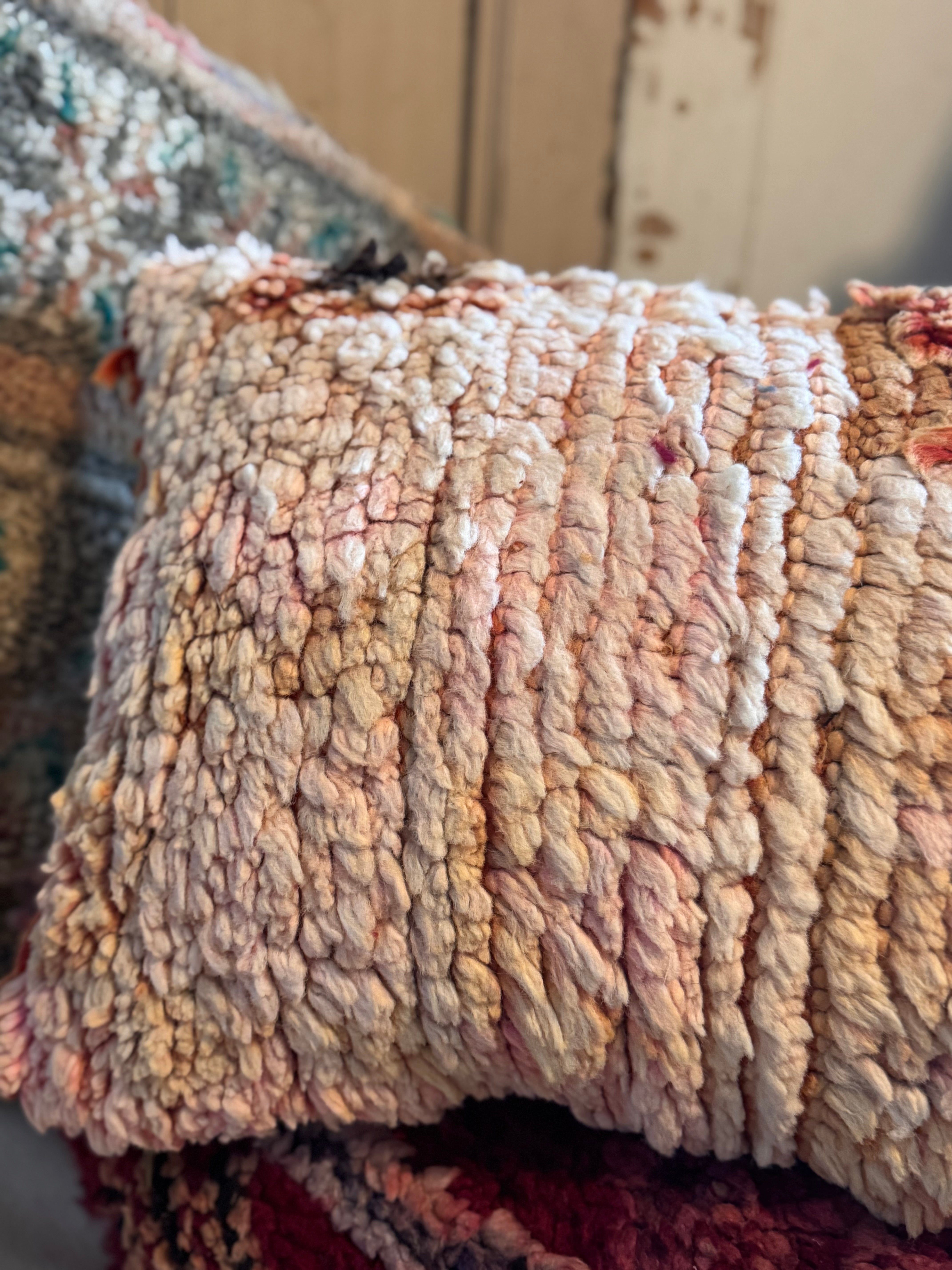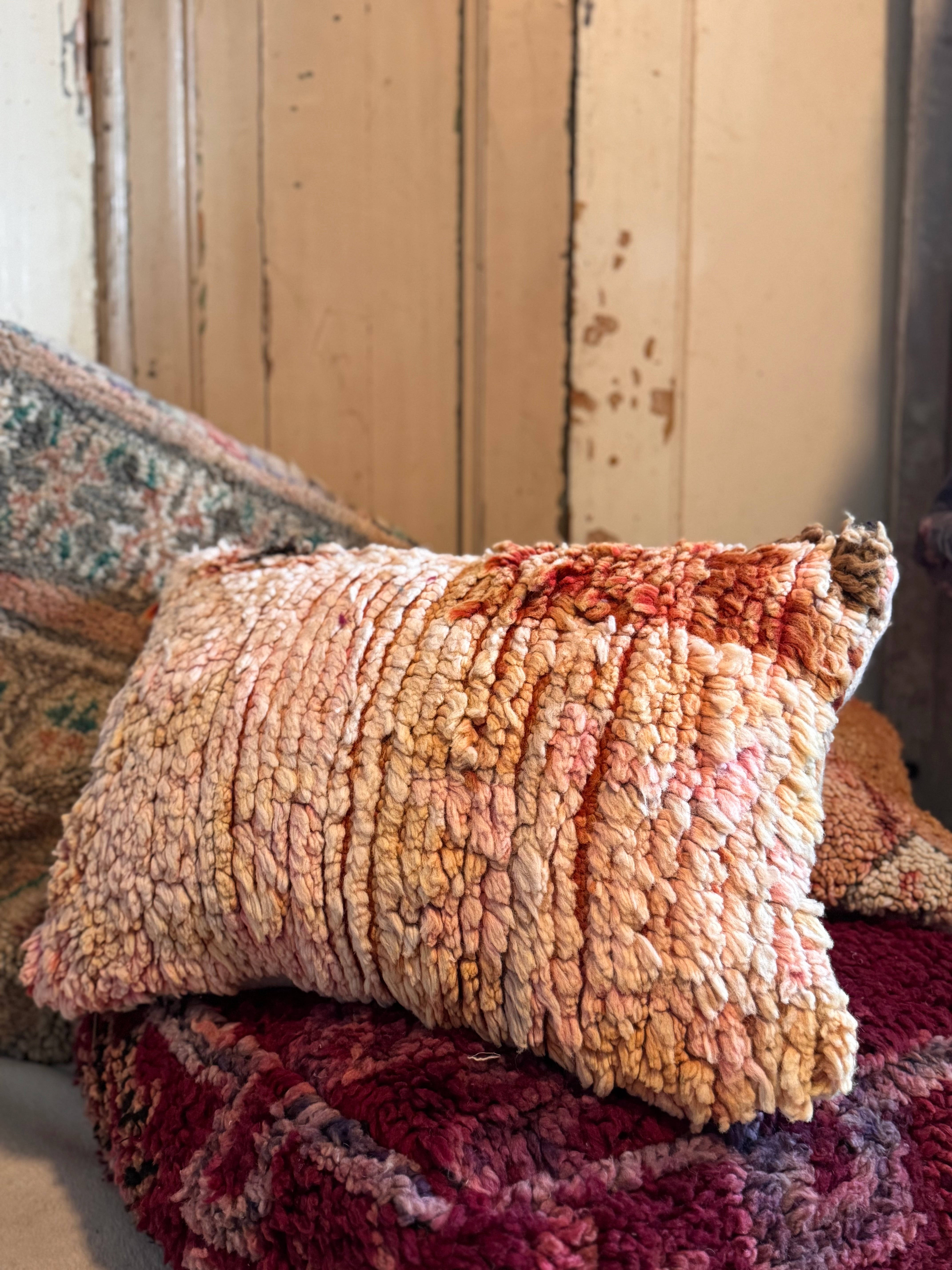 Een prachtige upcycled kussenhoes , handgemaakt in Marokko. Gemaakt van vintage kelims en berber tapijten, in een prachtige combinatie van materialen en kleuren. Boho perfect, dubbelzijdig of met katoenen keria achterkant.