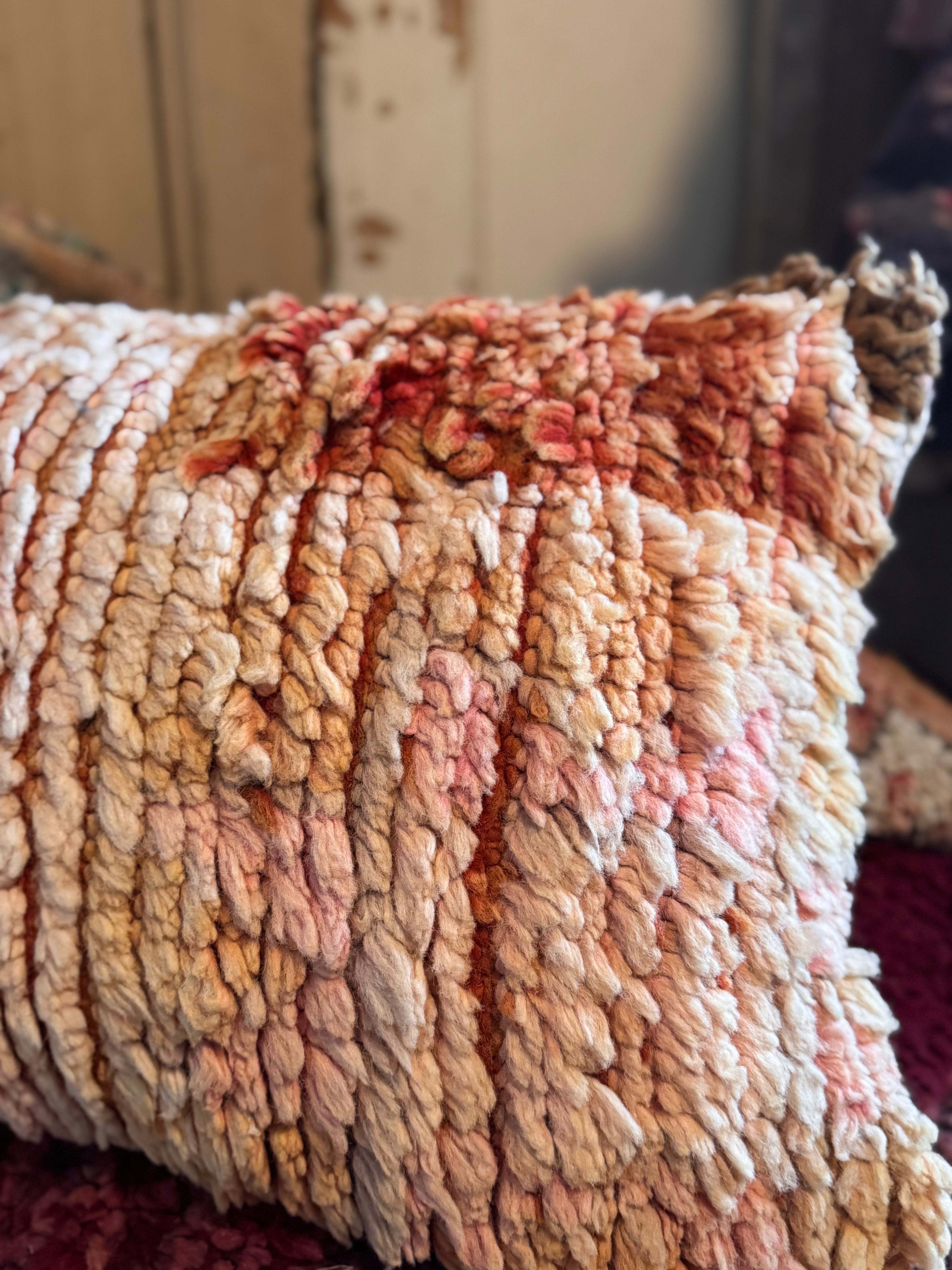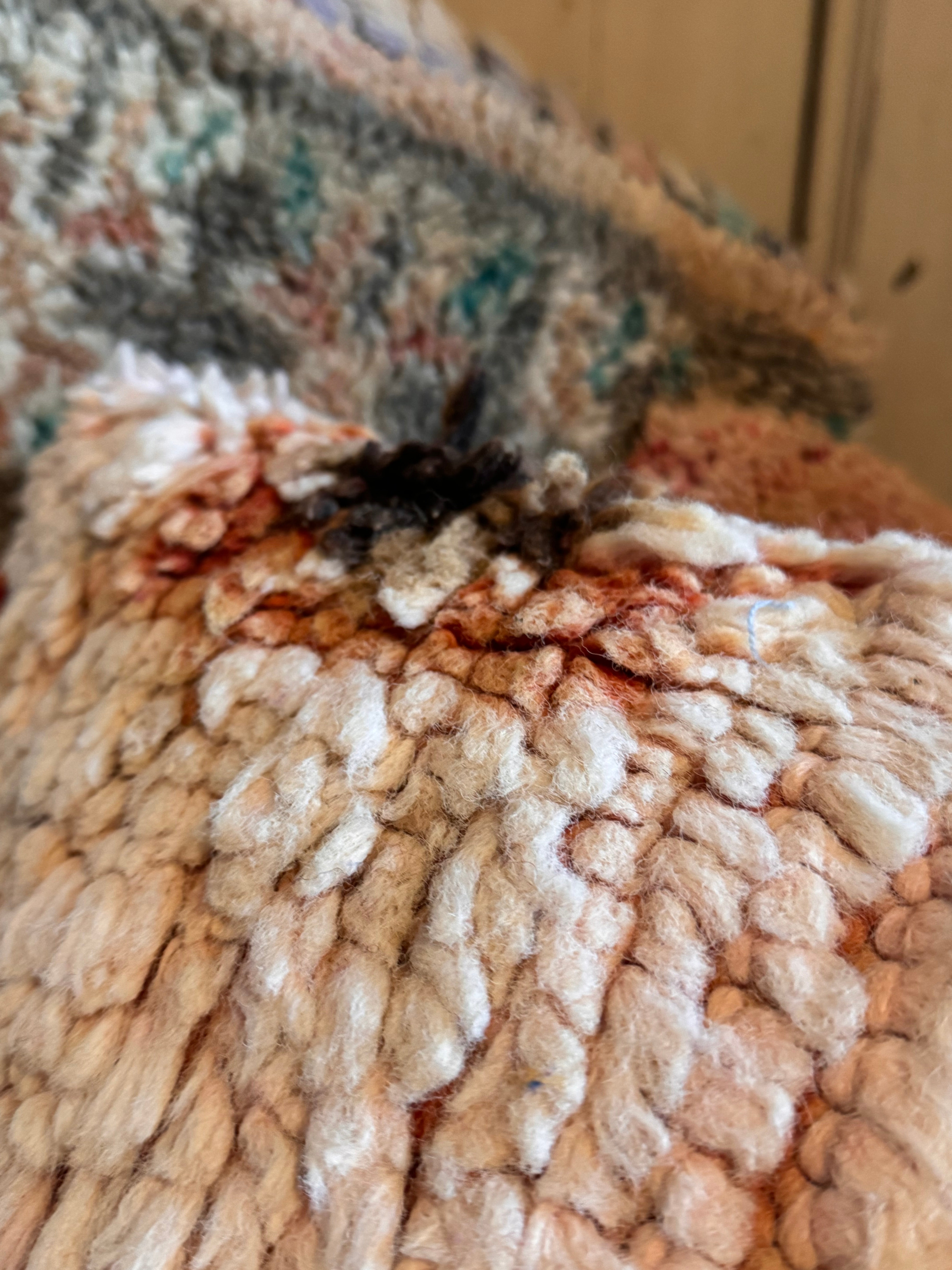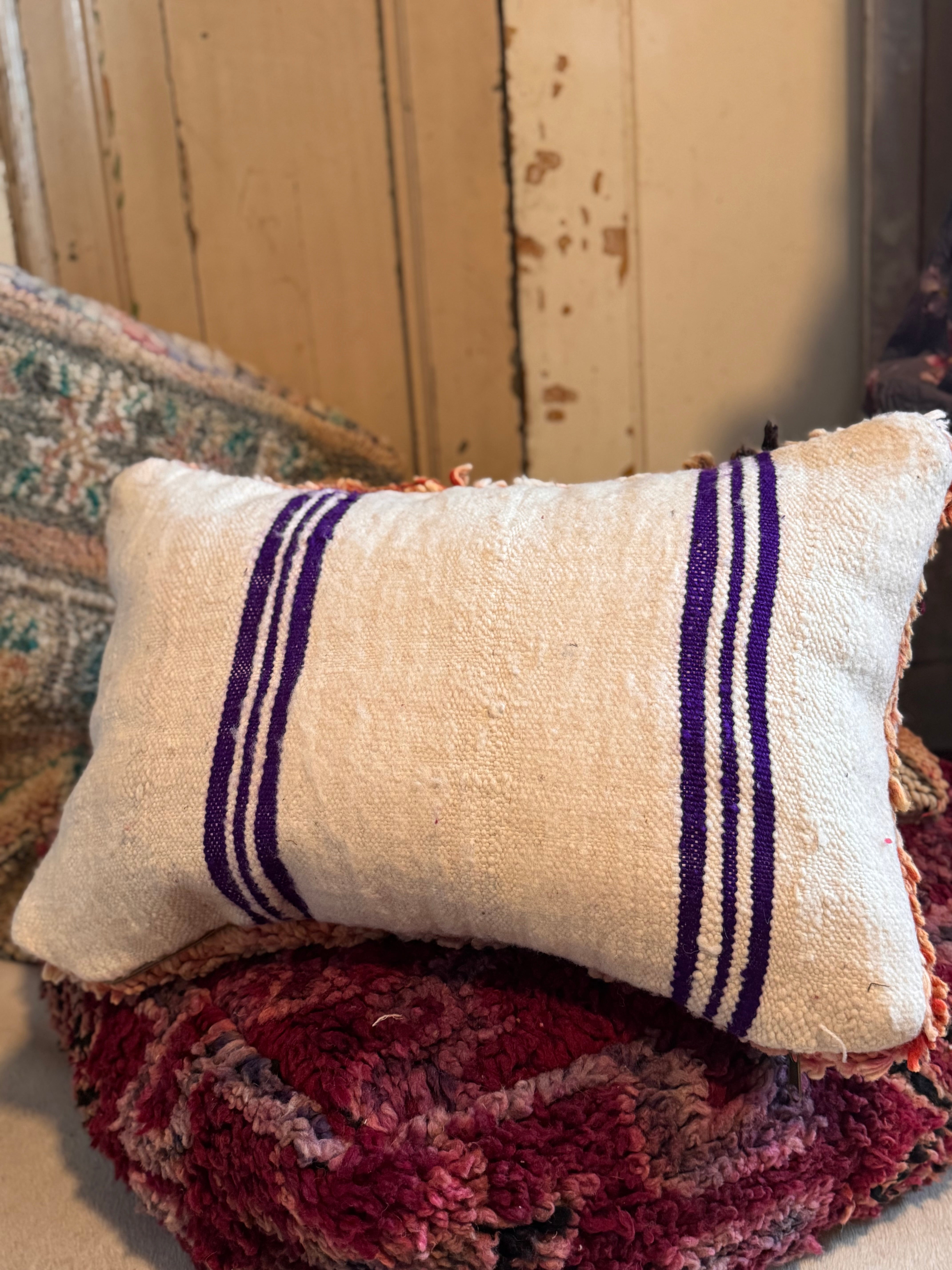 Een prachtige upcycled kussenhoes , handgemaakt in Marokko. Gemaakt van vintage kelims en berber tapijten, in een prachtige combinatie van materialen en kleuren. Boho perfect, dubbelzijdig of met katoenen keria achterkant.